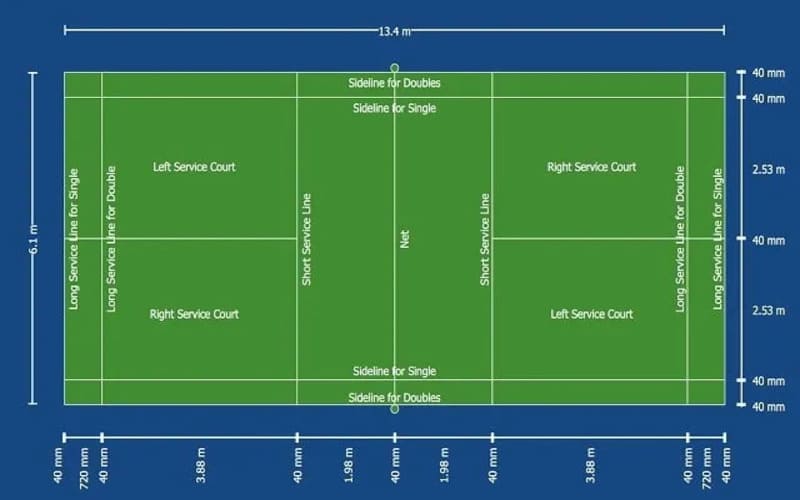 Theo tiêu chuẩn quốc tế, kích thước 13,40m x 6,10m bao gồm cả độ dày của các đường kẻ biên. Một số thợ thi công thường đo từ mép trong của đường kẻ này đến mép trong của đường kẻ kia, vô tình làm thu hẹp diện tích thực tế của sân.